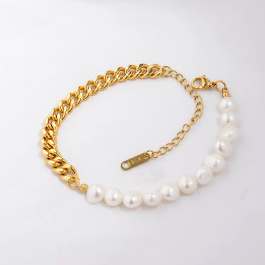 Chunky Freshwater Pearl & Cuban Chain Bracelet | 18K Gold Plated Steel | Adjustable 6"-8"